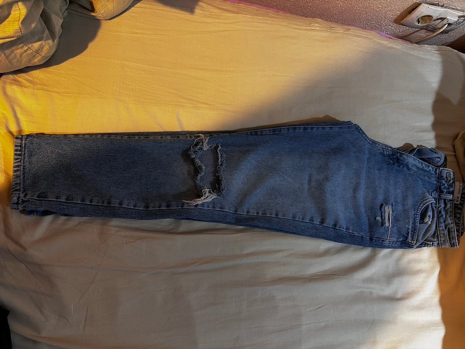 Kot kumaştan yapılmış, fitted kesim kadın pantolon. Mavi renkte, yırtık detaylı, günlük rahat sokak stili için uygundur. 25 bedendir
