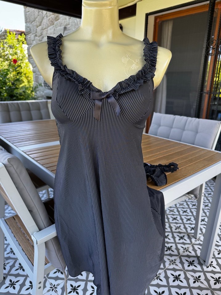 Sevim marka.Siyah ve gri çizgili, askılı, fırfırlı yakalı ve küçük fiyonk detaylı gecelik. Takım kilot var M beden uyumlu tertemiz. En 37 boy 65 cm