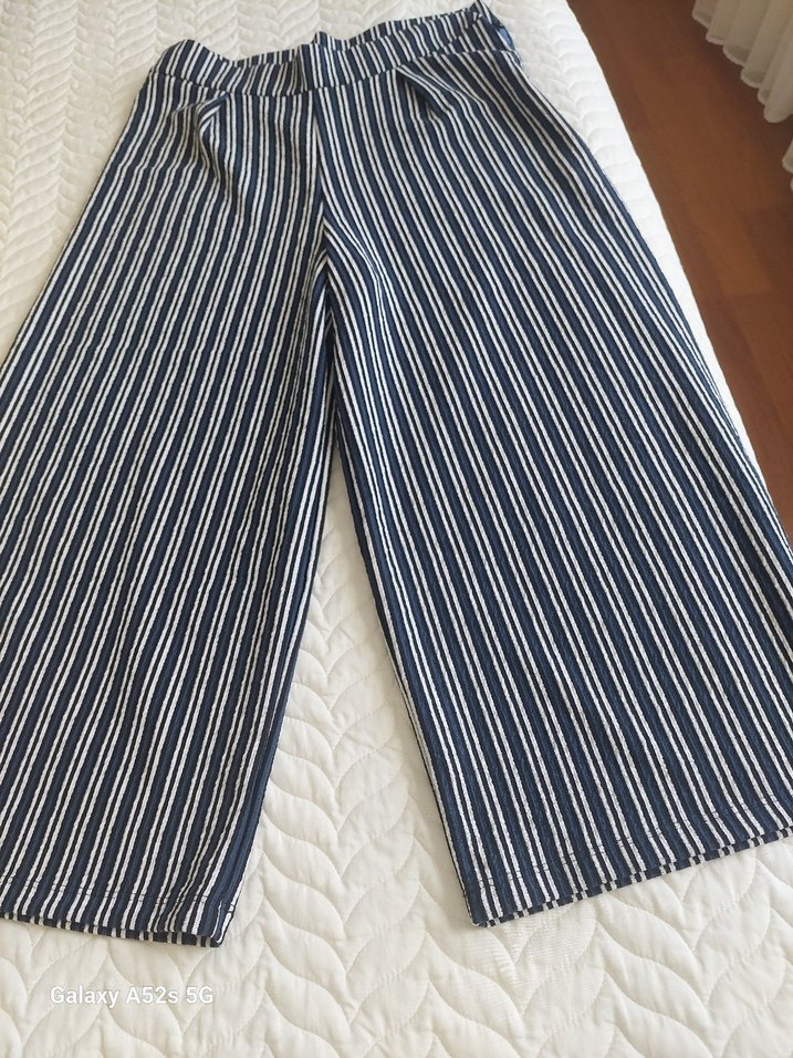 Kadınlar için uzun kesim, pilili ve çizgili desenli pantolon. Sentetik kumaştan, rahat kesim ve günlük bohem tarzda. boyu 82 cm hiç giyilmedi