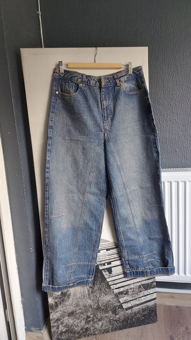 Kadınlar için geniş kesim, midi boy mavi kot pantolon. Bel kemerli ve gündelik sokak tarzına uygun.