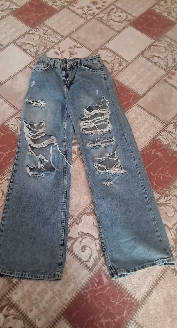 Kadın Geniş Kesim Yırtık Mavi Denim Pantolon