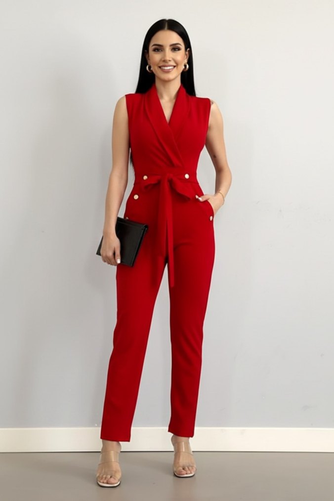 Kadın Gold Düğmeli Krep Kumaş Kendinden Kuşaklı Tulum ✨ DF-5002
