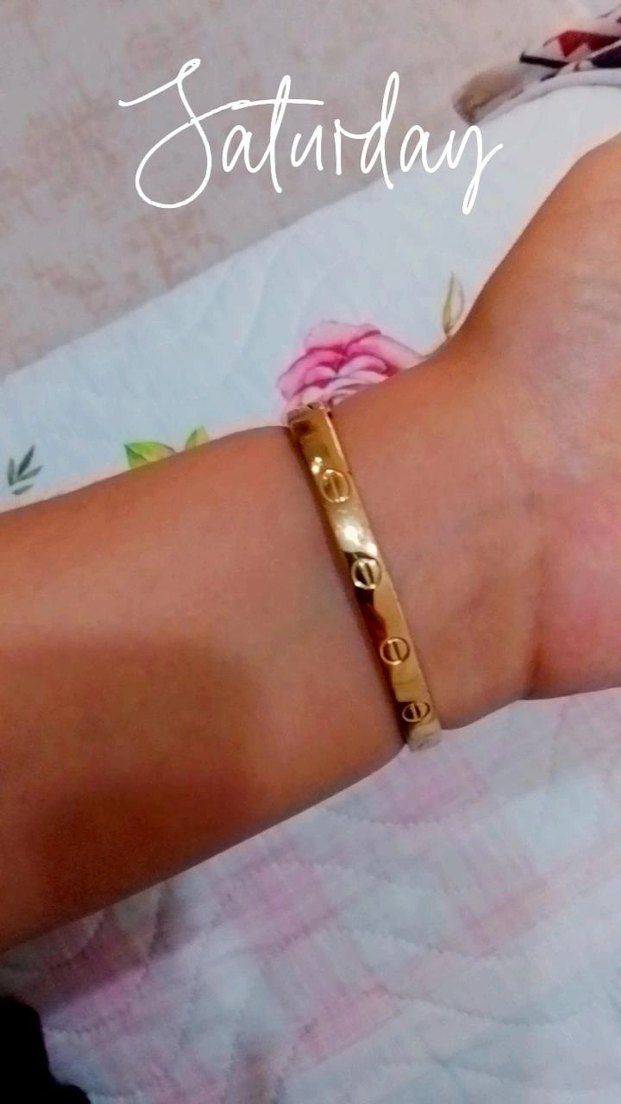 Altın renkli, minimal tasarımlı bileklik. Düz yüzeyi ve hafif dairesel detaylarıyla günlük sokak stiline uygundur. ✨