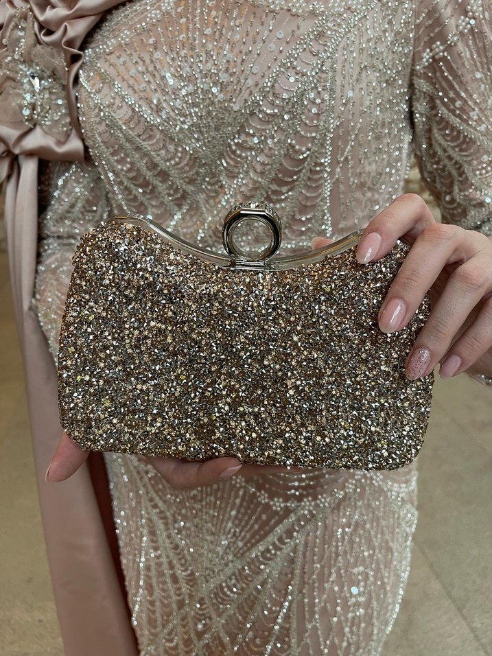 Altın renkli, payetli ve nakış detaylı sentetik kumaştan yapılmış parlak kadın portföy çanta. Düğünler ve klasik zarafet için uygun. ✨