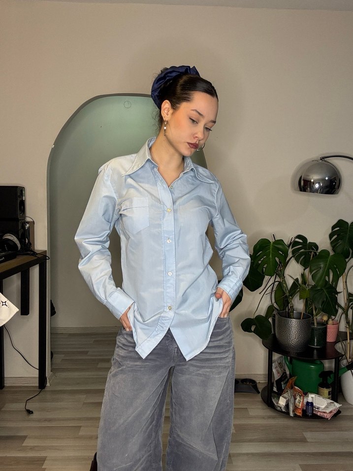Mavi yakalı ve uzun kollu kadın gömlek. Normal uzunlukta, rahat kesimli ve desensiz, ofis ve günlük kullanıma uygun şık bir parça.