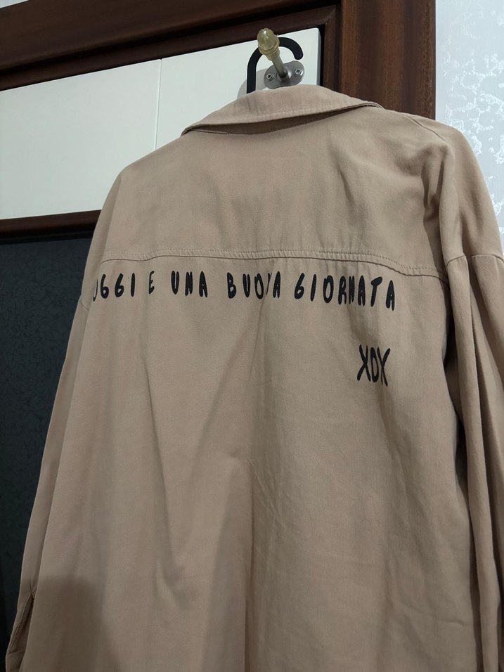 Bej renkli, keten kumaştan, uzun kollu ve düğmeli salaş kesim kadın gömlek. Sırtında baskılı yazı bulunur, günlük sokak stili için uygundur. Sadece bir defa giyildi