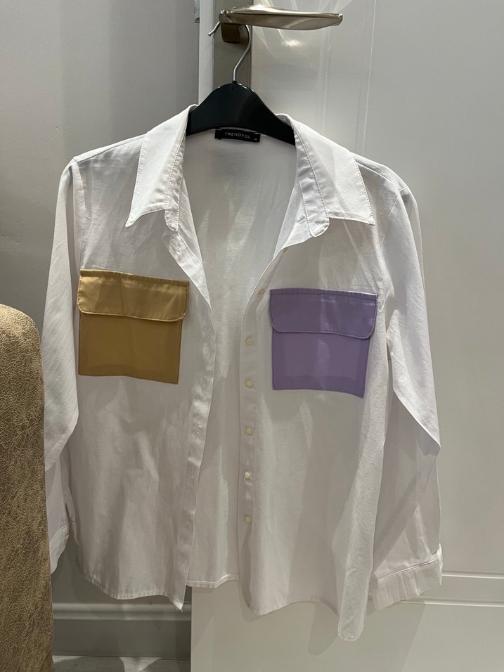 Beyaz uzun kollu düğmeli gömlek, sarı ve mor pastel cepler, kesik yaka ve normal kesim ile gündelik sokak stiline uygun.