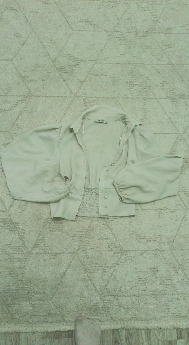 Bej keten kumaştan, uzun kollu, düğmeli ve notalı yaka detaylı, bol kesim bolero. Düz ve desensiz tasarım.