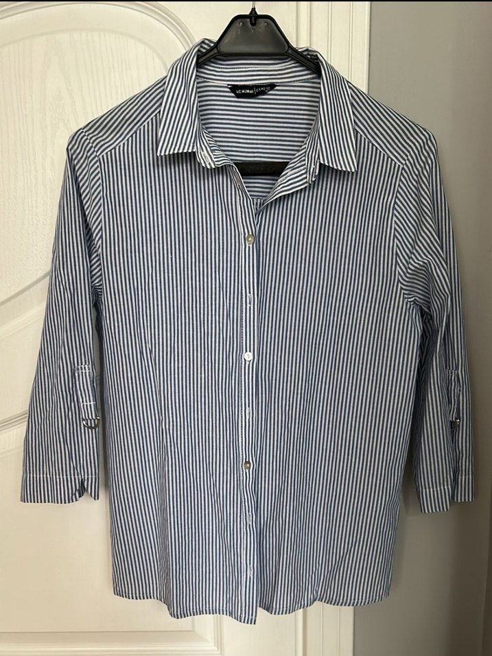 mavi beyaz çizgili gömlek. az kullanıldı. defosuz, temiz önü kapalı şekilde eni 48 cm boyu 60 cm. kol boyu 44 cm katlanabilir kol detayı var.