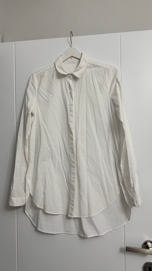 Kadınlar için beyaz poplin kumaştan, yakalı ve uzun kollu gömlek. Rahat bol kesim ve midi boyda, sade ve minimal tarzda günlük kullanıma uygun. Önü kısa arkası uzn
