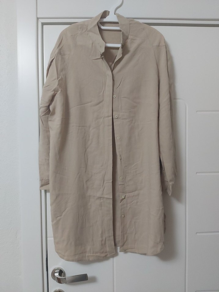 Bej kumaştan, uzun kollu, yakalı, midi boyda, bol kesim kadın gömlek. kolları pileli şık bir gömlek