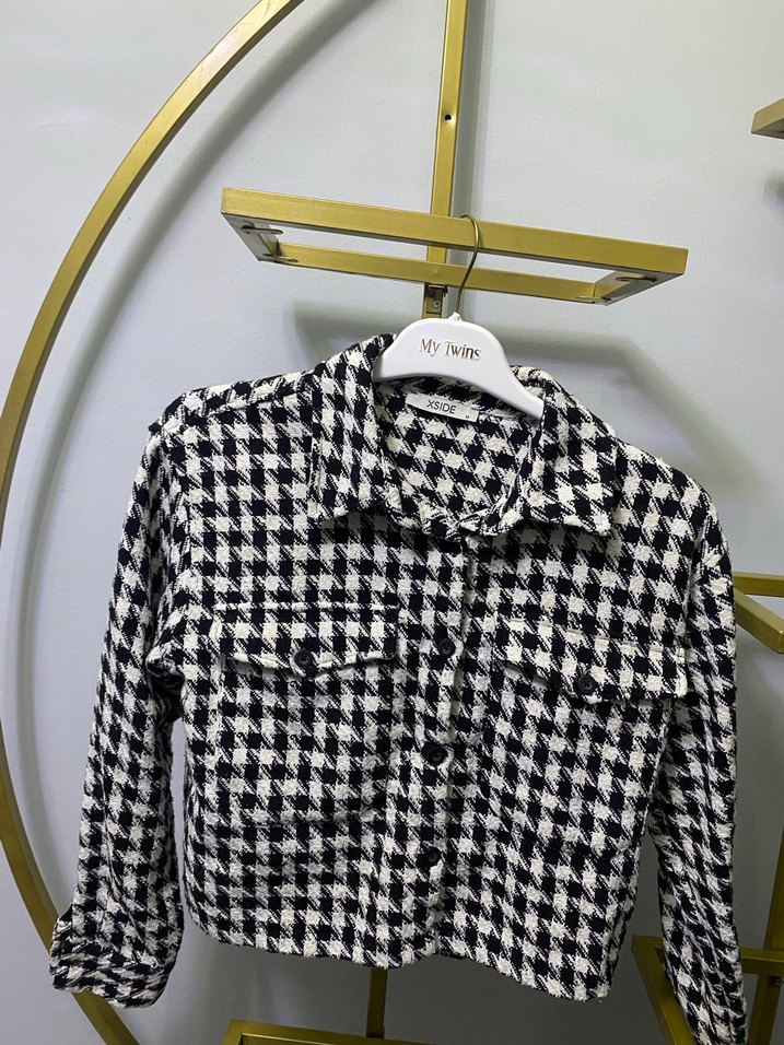 Düğmeli, kısa kesim, uzun kollu ve çıtçıtlı yakalı kadın gömlek. Siyah beyaz kareli deseni ve regular kesimi ile gündelik kullanıma uygun.