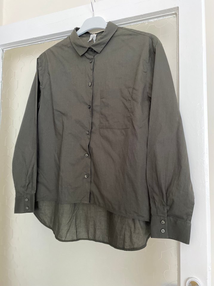İnce rahat kumaş gömlek. Önü kısa arkası uzun. Haki yeşil renginde.
