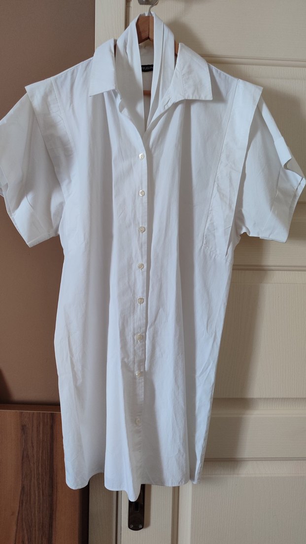 Düğmeli, kısa kollu, yakalı beyaz gömlek elbise. Rahat kesim ve midi boy, minimal tasarım ile günlük kullanım için uygundur.