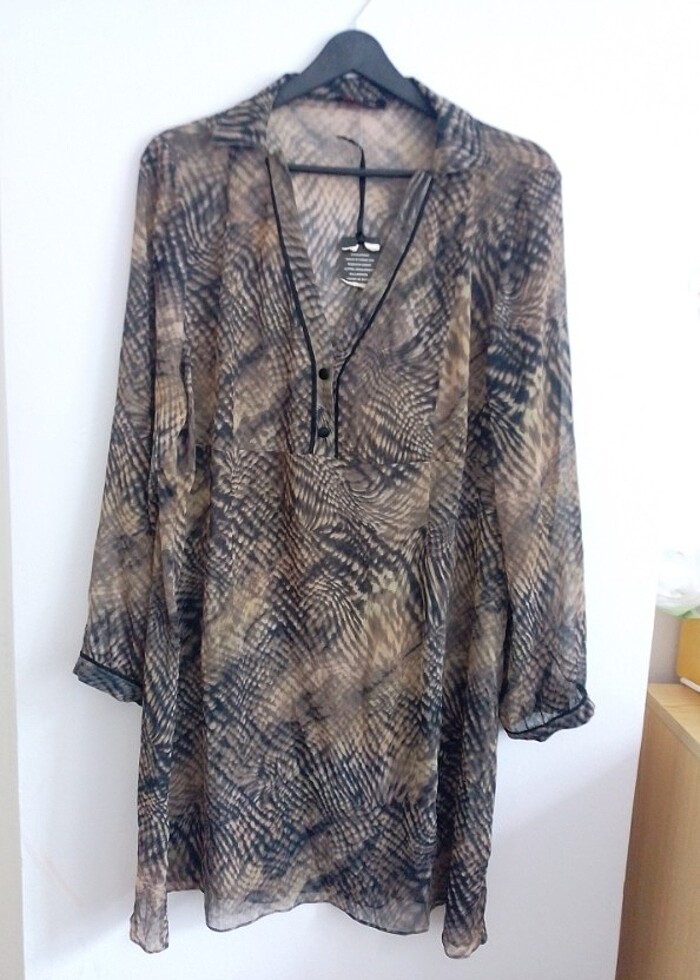 Çok şık transparan atletle gömlek/tunik veya astarla elbise olarak kullanilabilir. 44 beden. Sıfır ürün. Omuzdan etek ucuna boyu 85 cm. Göğüs 55 cm