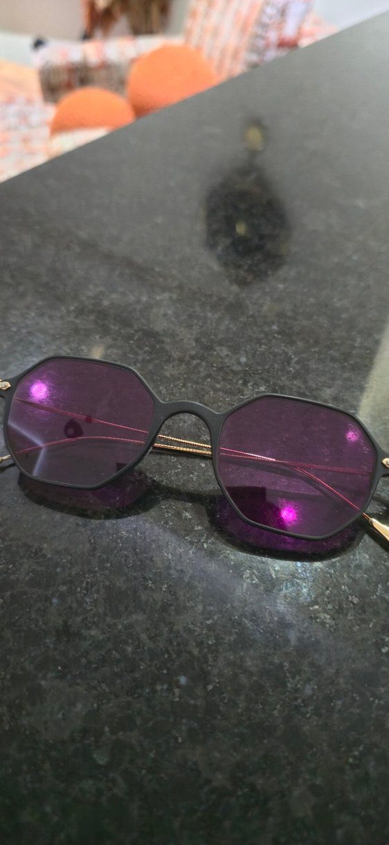 siyah çerçeveli, koyu pembe renkli, benzersiz çokgen şekilli kadın gözlüğü. Moda ve avangart tarz için ideal. ️