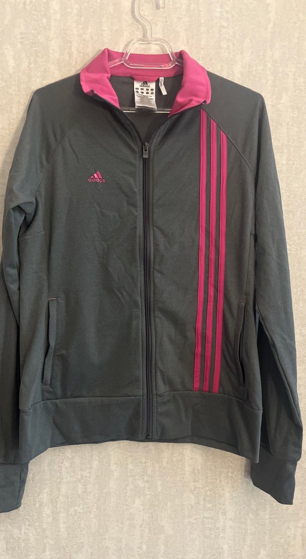 Gri, uzun kollu, fermuarlı ve yüksek yakalı kadın ceketi. Pembe şeritler ve cepler bulunur, sportif ve rahat kullanıma uygun.