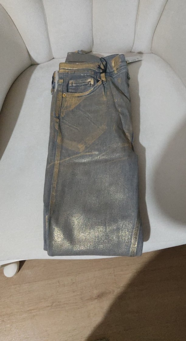 Kadınlar için gri denim üzerine altın parlaklığı ve tokalı detaylar içeren, sokak stili uyumlu dar kesim pantolon.