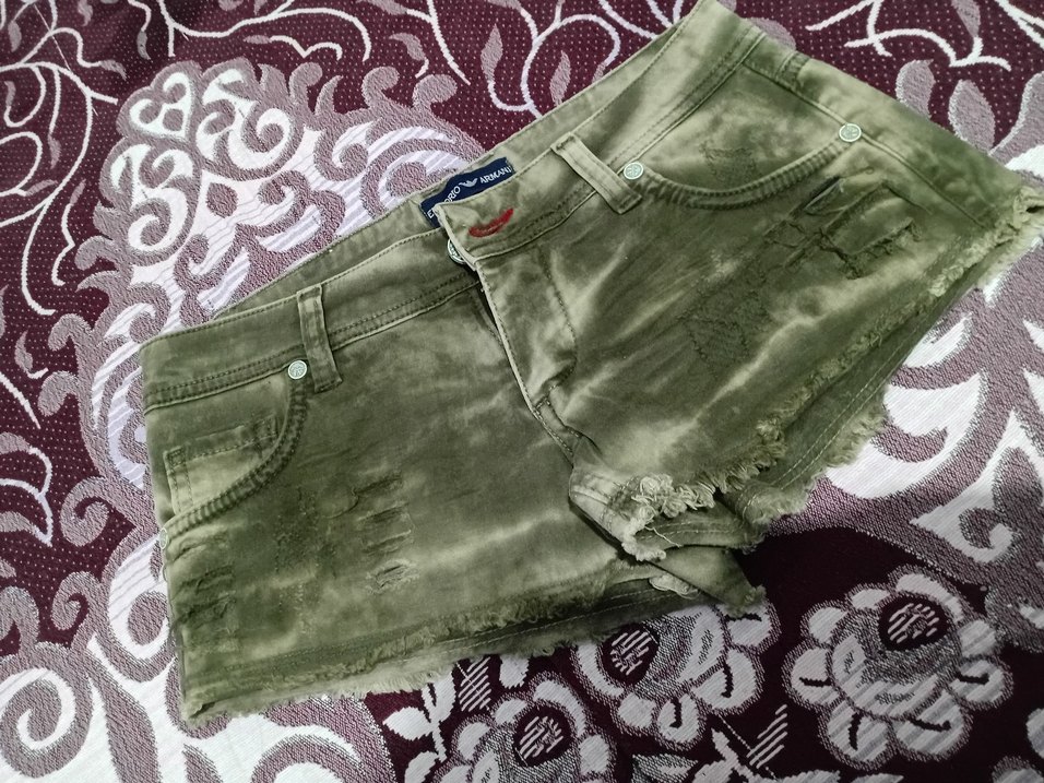 Gri bağlama desenli süet kumaştan, düğmeli ve bol kesim kadın mini şort, sokak modasına uygun.