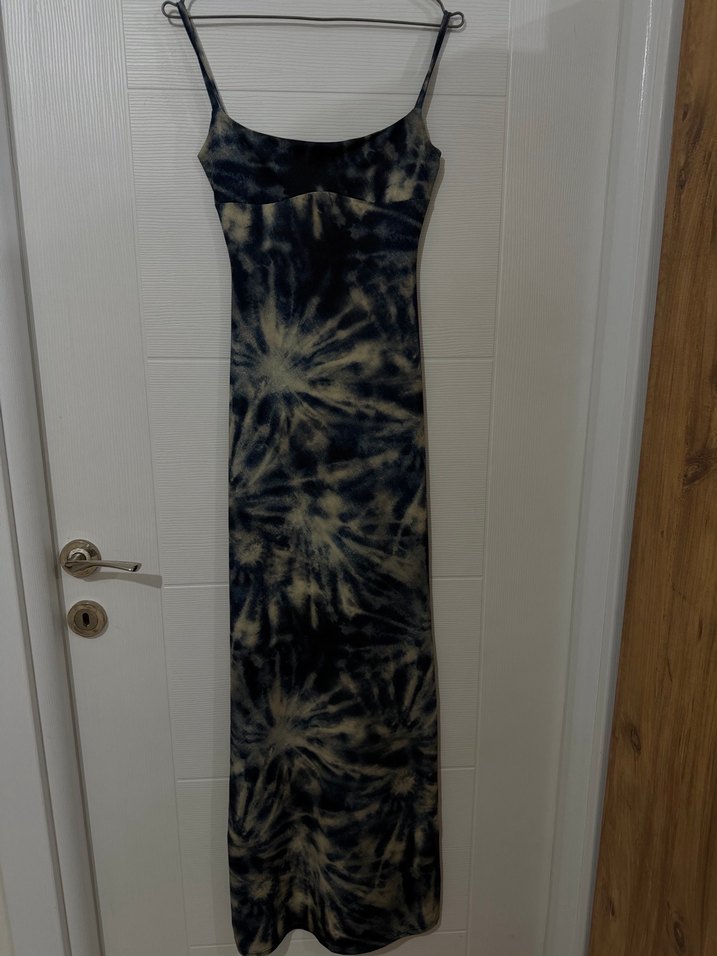 Dar kesim, askısız, uzun elbise; koyu gri bağlama desenli ve drapeli tasarıma sahip. Yumuşak sentetik kumaştan, sokak stili ve bohem tarzına uygun.