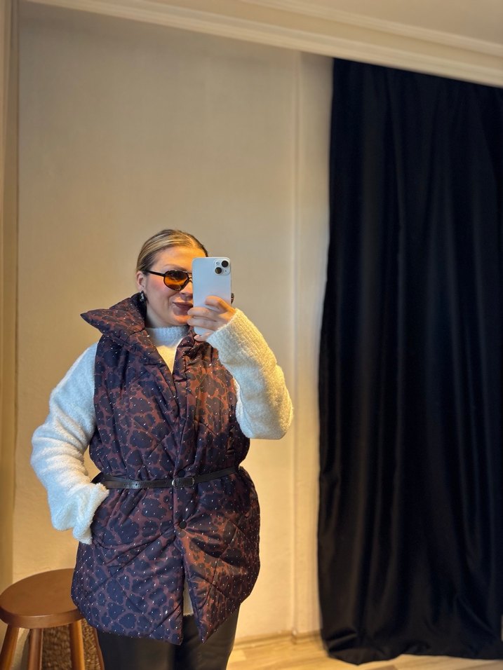 Gri bağlamalı desenli, kürklü detaylı, yüksek yakalı, bol kesim kadın puff yelek. Rahat ve sıcak hissiyle gündelik kullanıma uygun.