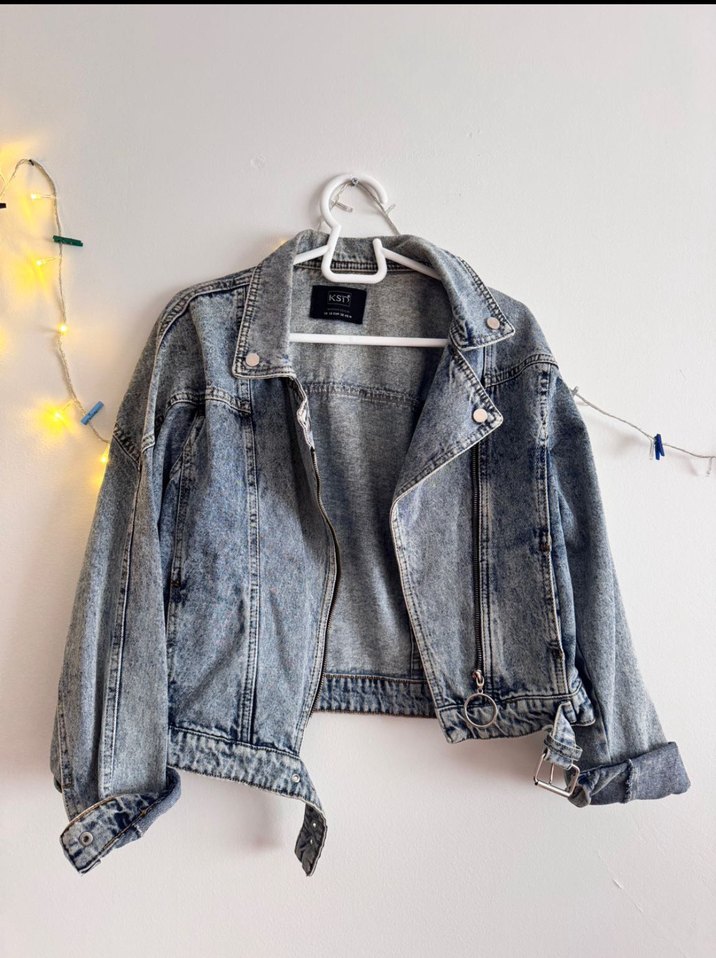 Bağlamalı kayışlı, salaş kesim gri tie-dye denim ceket. Notch yakalı, günlük kullanıma uygun rahat sokak stili.