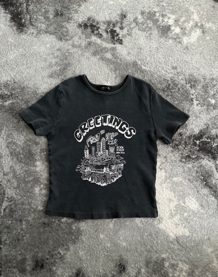 Gri renkli, kısa kollu, baskılı kadın tişörtü. Denim kumaştan, bol kesim ve yuvarlak yaka ile günlük sokak stiline uygun.