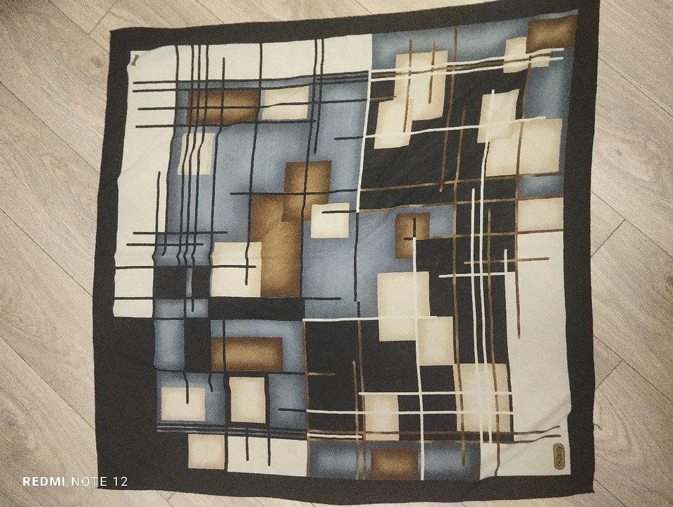98 cmX 98 cm Kare Eşarp. İp çekmeleri mevcut. Kullanıma engel değil. Kadınlar için koyu gri renkli, baskılı geometrik desenli, yumuşak sentetik kumaştan modern eşarp