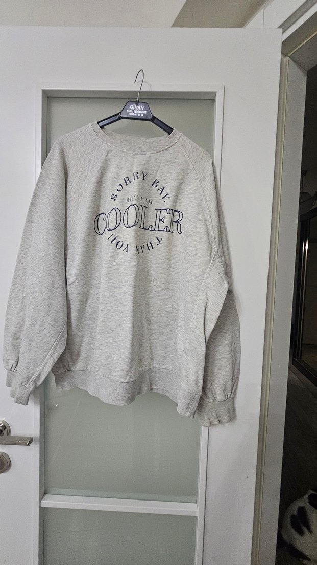 Pamuklu, gri renkli, yuvarlak yaka ve uzun kollu bol kesim sweatshirt. Üzerinde "COOLER" yazılı baskı bulunur, günlük kullanım için rahat ve şık.