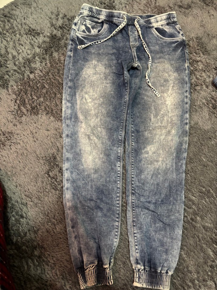 Kot paçaları lastikli Gri batik desenli, kemerli, bol kesim kadın jean.rahat kesimiyle günlük kullanım için uygundur.