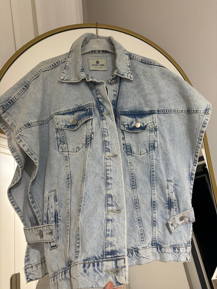 Gri tonlarda batik desenli, düğmeli ve kolsuz bol kesim denim ceket. Normal boyda, sokak tarzı ve günlük kullanıma uygun.