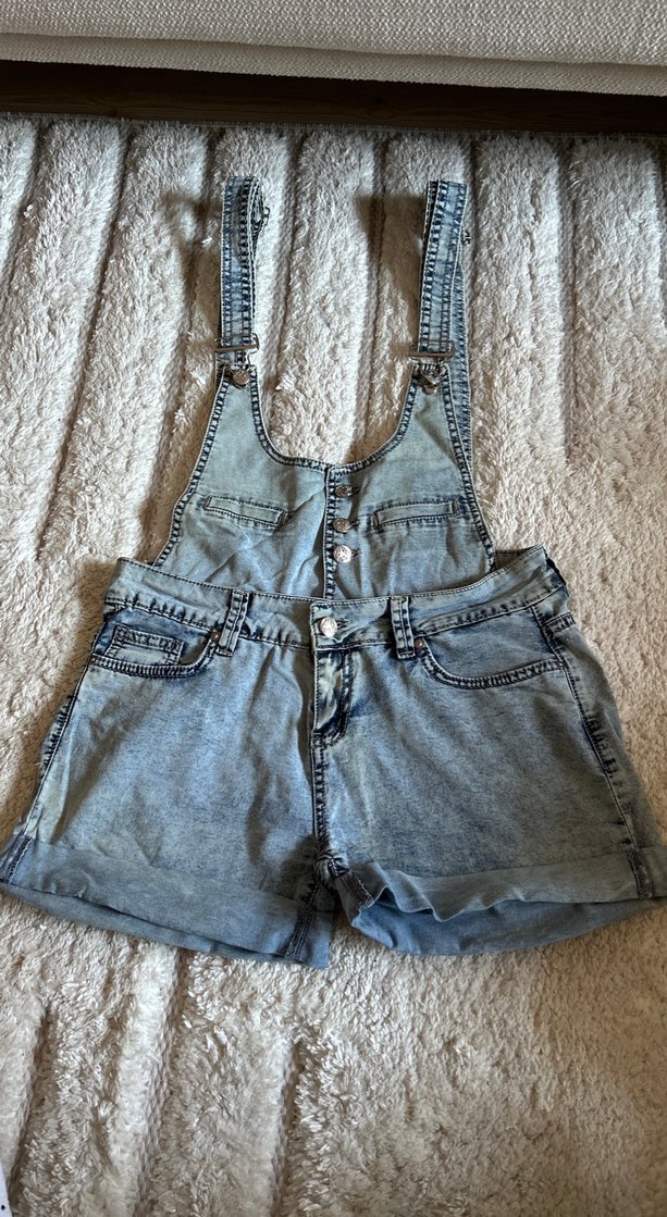 Gri batik desenli, askısız yaka ve tokalı askılara sahip bol kesim kot şort tulum, günlük sokak stili için uygun.besen tablosunda Euro 42 yazıyor ancak S besen. 42 asla olmaz benim kızım lisede giydi