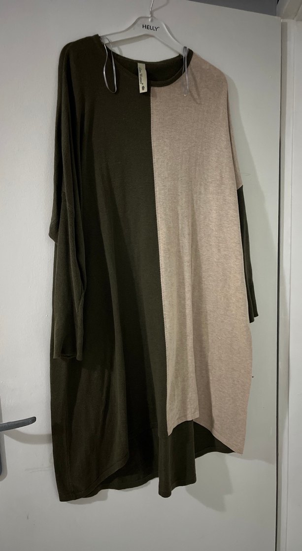 Kadın tunik, uzun kollu ve salaş kesimli, drapeli tasarıma sahip. Gri ve bej renklerde, sentetik kumaştan üretilmiş, günlük rahat kullanım için uygun.