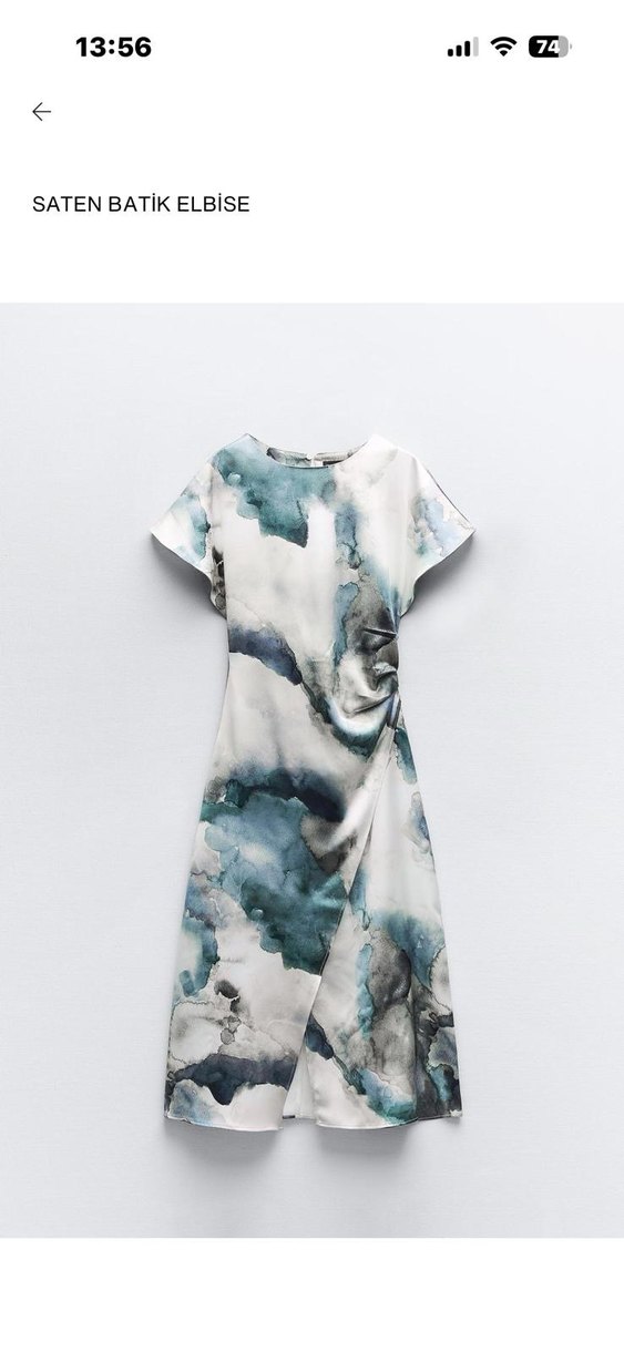 Kadınlar için gri ve beyaz batik desenli, drapeli ve kısa kollu, ince kesimli uzun elbise. İpeksi kumaştan üretilmiş, V yaka ve çağdaş stile sahip, günlük kullanım için uygun.