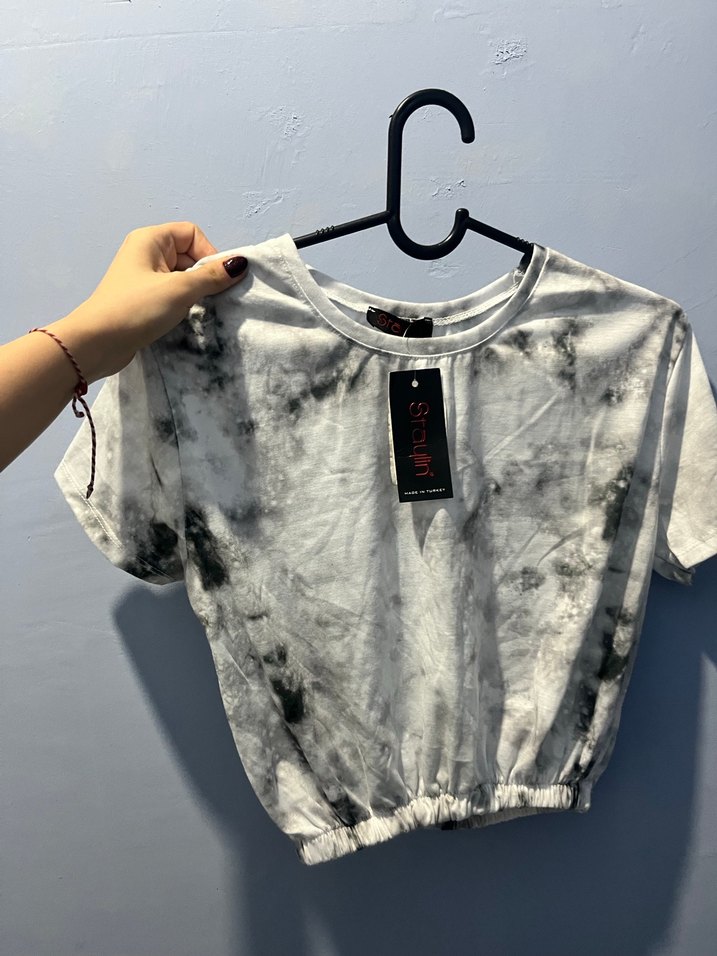 Kadınlar için batik desenli, kısa kollu ve yuvarlak yaka tişört. Pamuklu, bol kesim ve kısa boy, sokak modasına uygun rahat bir tasarım.