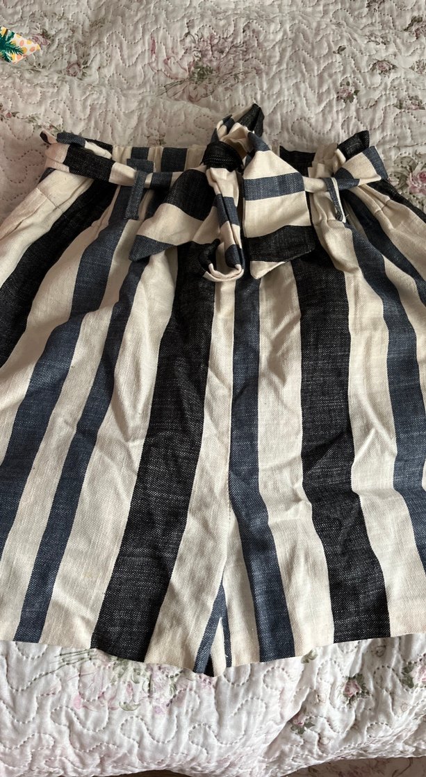 Kadın keten şort, pileli detaylı ve bol kesimdir. Midi boyda, gri ve beyaz çizgili, bohem tarzda, rahat kullanım için uygundur.