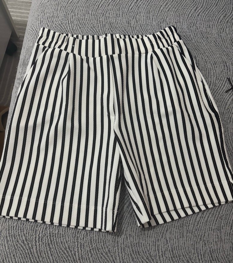 Kadınlar için yüksek bel, bol kesim, pile detaylı ve gri beyaz çizgili desenli, yumuşak sentetik kumaştan mini şort. Rahat sokak stili için uygundur. Cepli.
