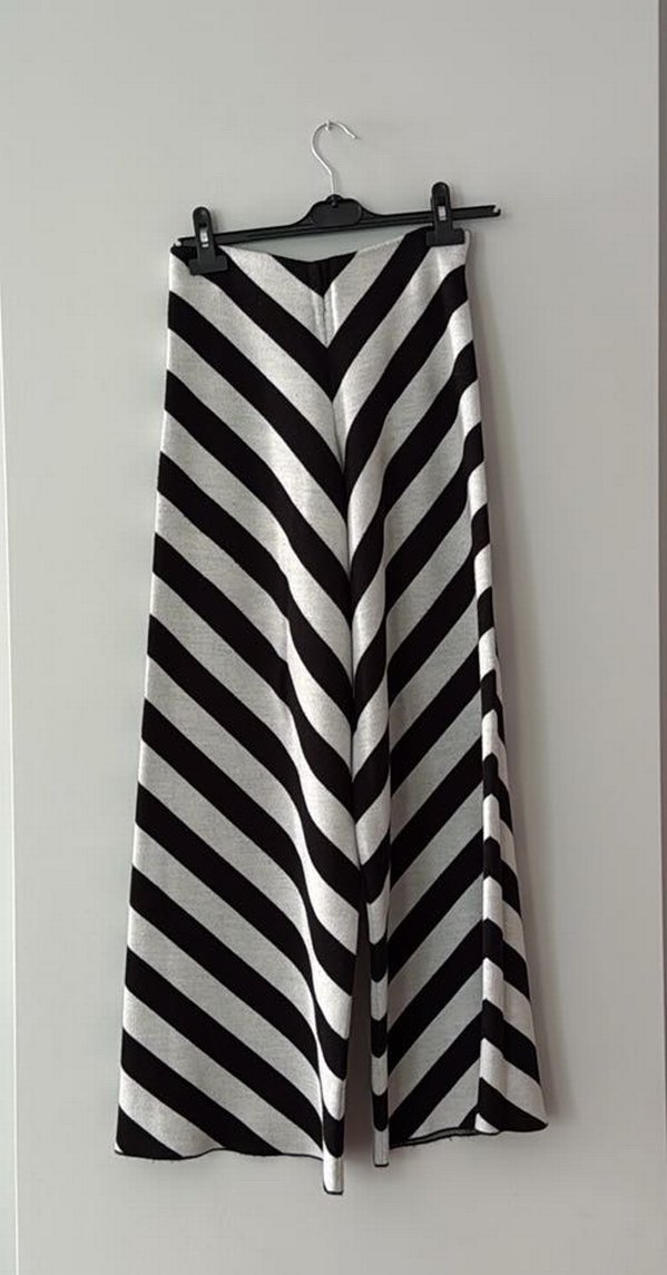 Uzun boy, siyah ve beyaz çizgili kadın kumaş pantolon. Düzenli kesim ve çağdaş tarzıyla günlük kullanıma uygun.