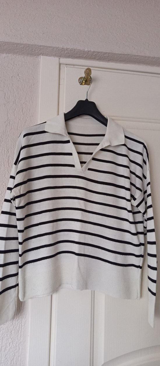 Kadınlar için polo yaka ve uzun kollu, bol kesim bir kazak. Yumuşak pamuktan örülmüş, gri ve beyaz çizgili desene sahip, günlük rahat sokak tarzı için uygundur.