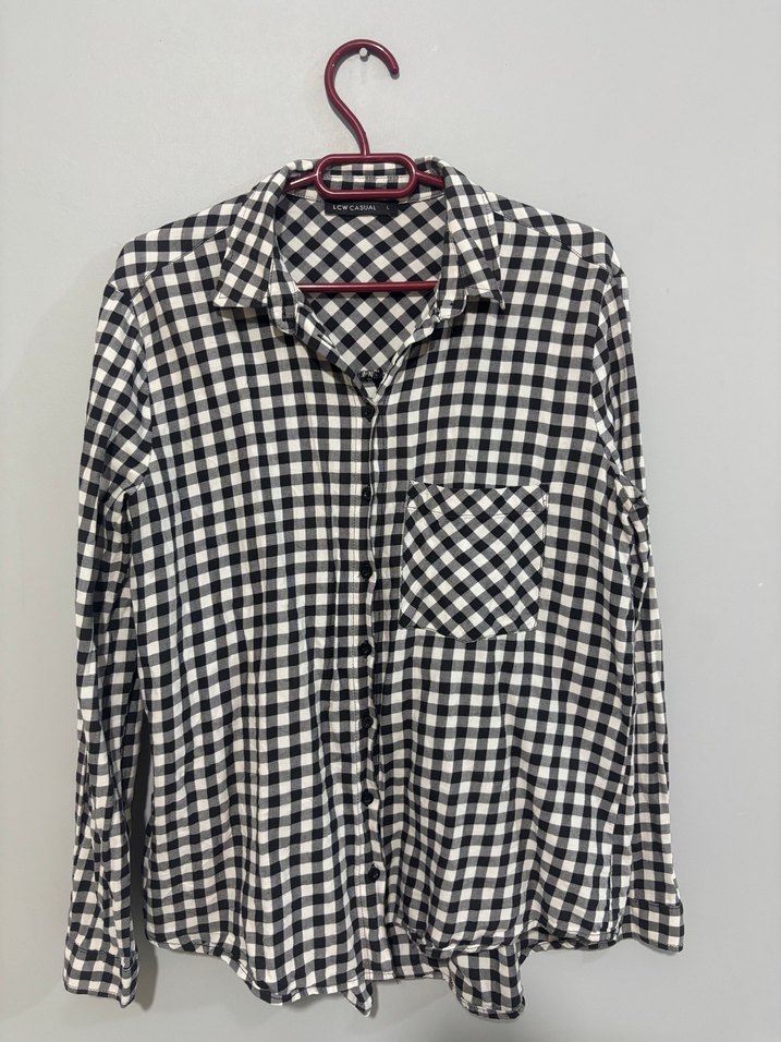 Kadınlar için pamuklu, gri beyaz kareli, düğmeli, uzun kollu, normal boyda, rahat kesim gömlek. Notlu yaka ve tek cep detayına sahip, günlük ve sokak stiline uygun.
