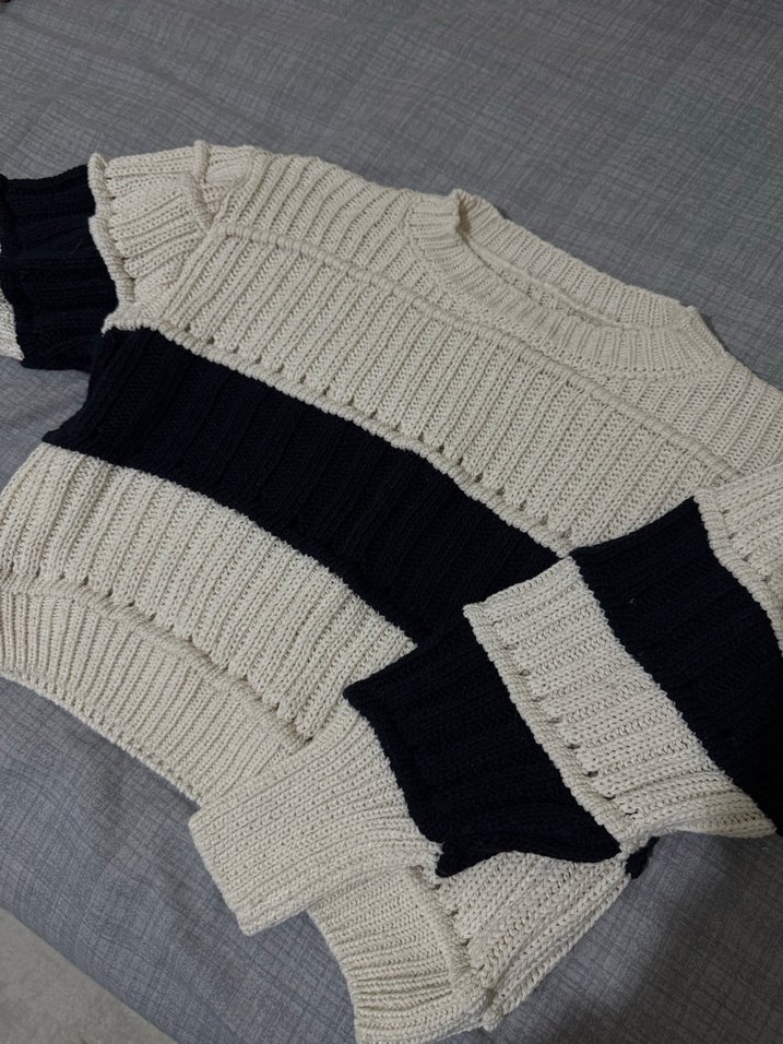 Gri ve beyaz renk bloklu, uzun kollu ve yuvarlak yakalı, rahat kesim örgü kadın kazak. Günlük sokak stili için uygundur.