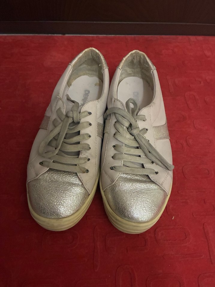 Gri ve beyaz renklerde, düz tabanlı kauçuk kadın sneakers ayakkabılar. Desensiz, günlük kullanım için şık ve rahat bir tasarım sunar.