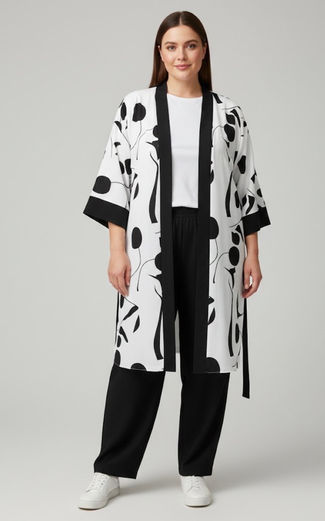 Kadınlar için gri beyaz renklerde, uzun kollu, bol kesim, yakalı ve salaş tarzda, bağcıklı kimono. Günlük kullanıma uygun, minimalist ve çağdaş tasarım.