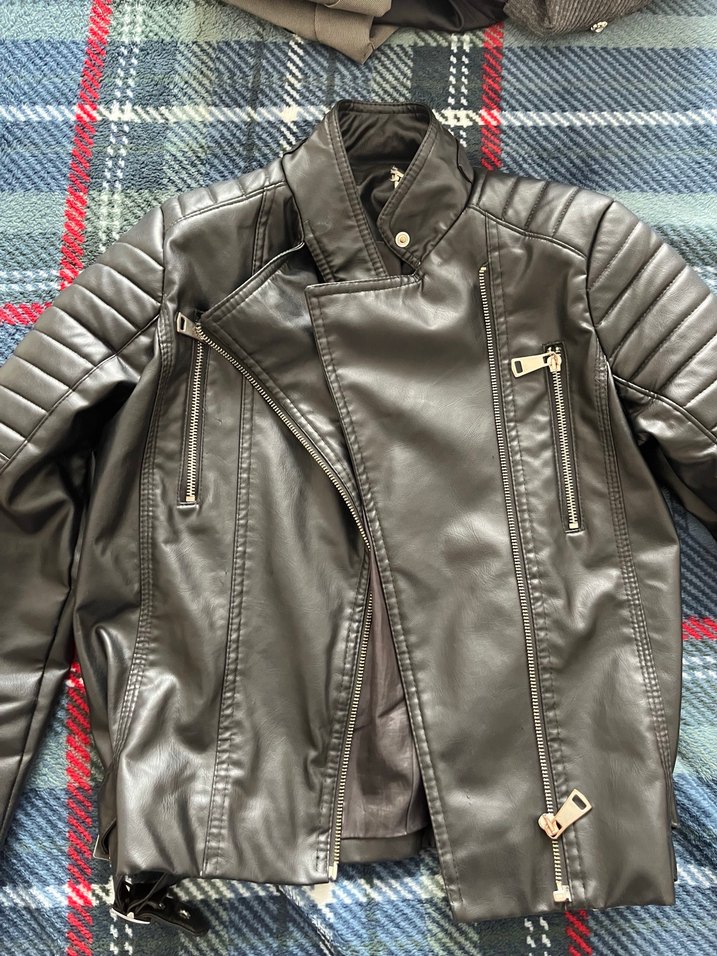Gri renkte, fermuarlı cepleri ve kesik yaka detayı olan, dar kesim biker tarzı kadın deri ceket. Askılı kollu ve normal boyda, günlük kullanıma uygun.