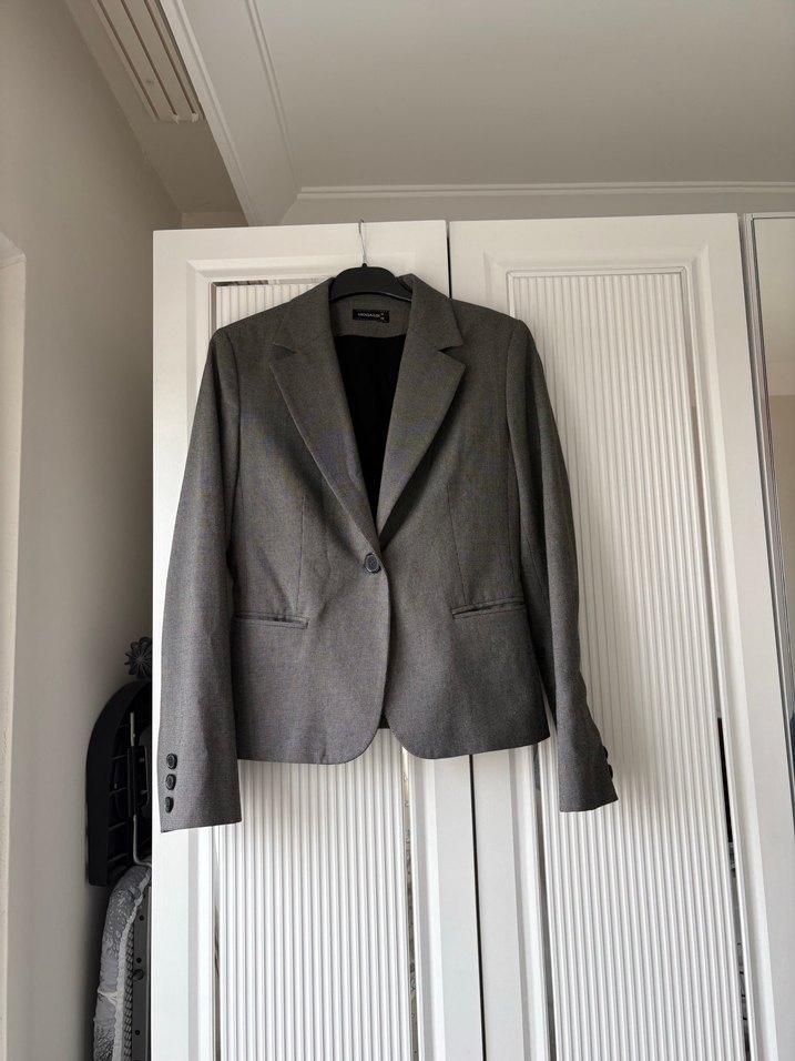 Bu kadın gri blazer, yaka kısmında kesik yakaya ve uzun kollara sahiptir. Normal kesim, düğmeli ve midi boyda olup ofis kullanımı için uygundur. Modern klasik stilde, desensiz ve sentetik kumaştandır.