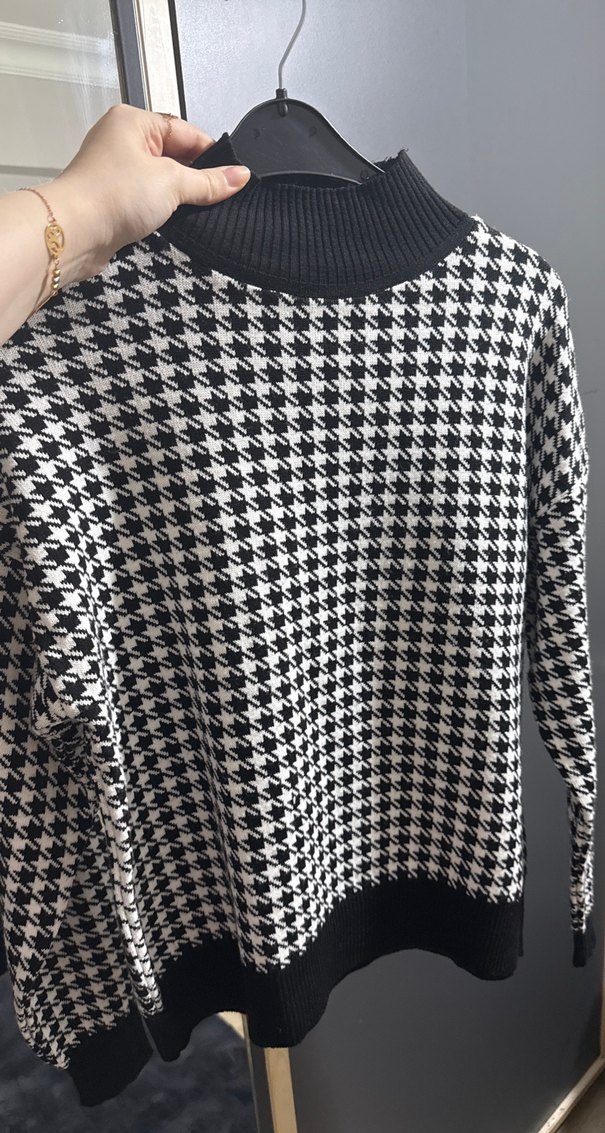 Kadınlar için boğazlı ve uzun kollu, yumuşak örme kumaştan yapılmış, bol kesim gri kazak. Siyah-beyaz kazayağı deseni ve siyah yaka ile kenar detayları içerir.