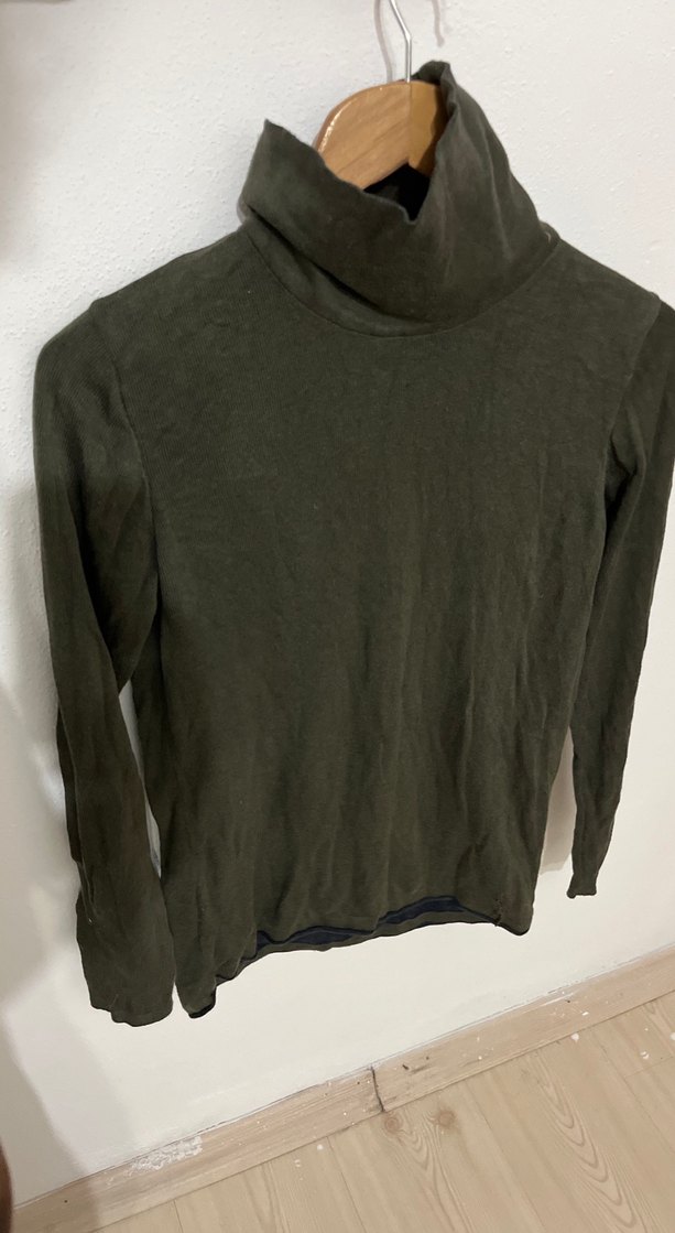Koyu gri renkte, keten kumaştan, boğazlı ve uzun kollu, vücuda oturan kadın kazak. Günlük kullanıma uygun sade ve rahat stil sunar.