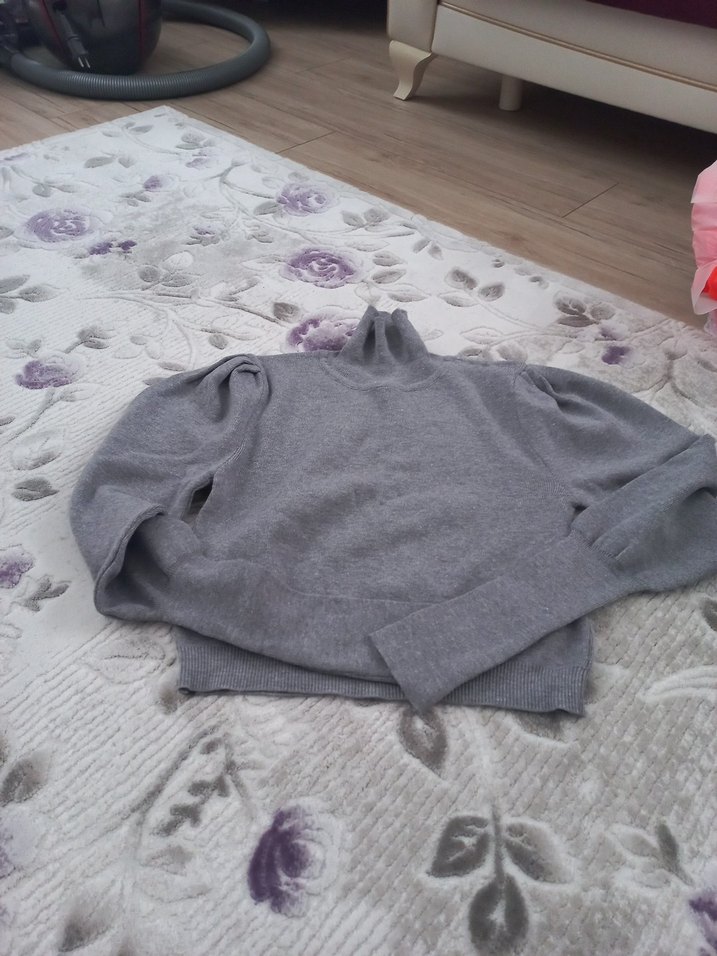 Kadınlar için bol kesim, uzun kollu ve boğazlı kısa örgü kazak. Yumuşak dokulu, düz gri renkte, günlük rahat kullanım için uygundur.