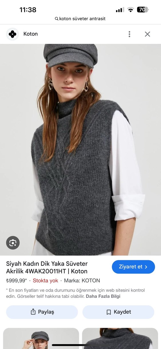 Gri renkte, boğazlı ve kolsuz örgü süveter. Rahat ve bol kesim yapısıyla gündelik kullanıma uygundur.