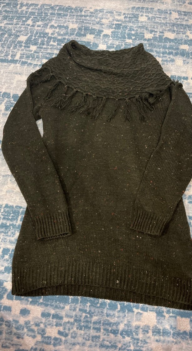 Kadın için uzun kollu, bohem püsküllü detaylı, koyu gri örgü kazak. Rahat ve günlük kullanım için uygun, bol kesim.
